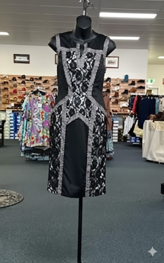 This dress has a v neckline with fitted bodice and lace panelling over straight skirt, sleeveless and zipper closure at back. The dress is made from polyester. The colour is black.