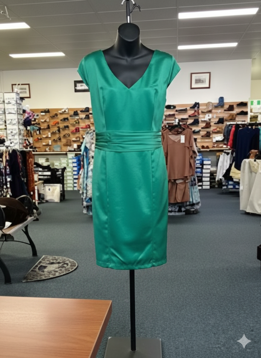 This dress has a v neckline with gathered waist band and staight skirt. The dress is made from polyester and is lined. The colour is emerald green.