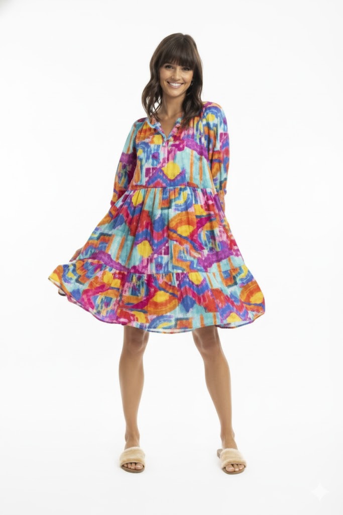 The Frida dress is so colourful and unique! Featuring a mandarin collar, raglan sleeves, a tiered skirt that falls at the knee, gathered three-quarter frill sleeves, and colourful tropical prints, this dress is so fun to wear! This is the perfect dress for a day out at the beach.