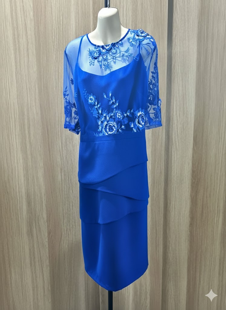 This dress has a round neckline with lace bodice and layered skirt with 3/4 sleeve and back zipper. The dress is made from polyester and lined. The colour is cobalt.