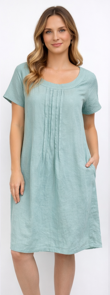The Mint Linen Dress is a beautifully simple, easy‑wear piece designed for everyday comfort and effortless style. Made from breathable linen, it features a classic round neckline, short sleeves, and a softly pleated bodice that adds gentle shape without feeling restrictive. The A‑line silhouette falls naturally over the body, creating a flattering fit for a wide range of figures, while the two side seam pockets bring practicality to the design. Australian-owned and Australian-made, this dress is a timeless wardrobe staple — perfect for warm days, relaxed outings, and casual layering through the seasons.