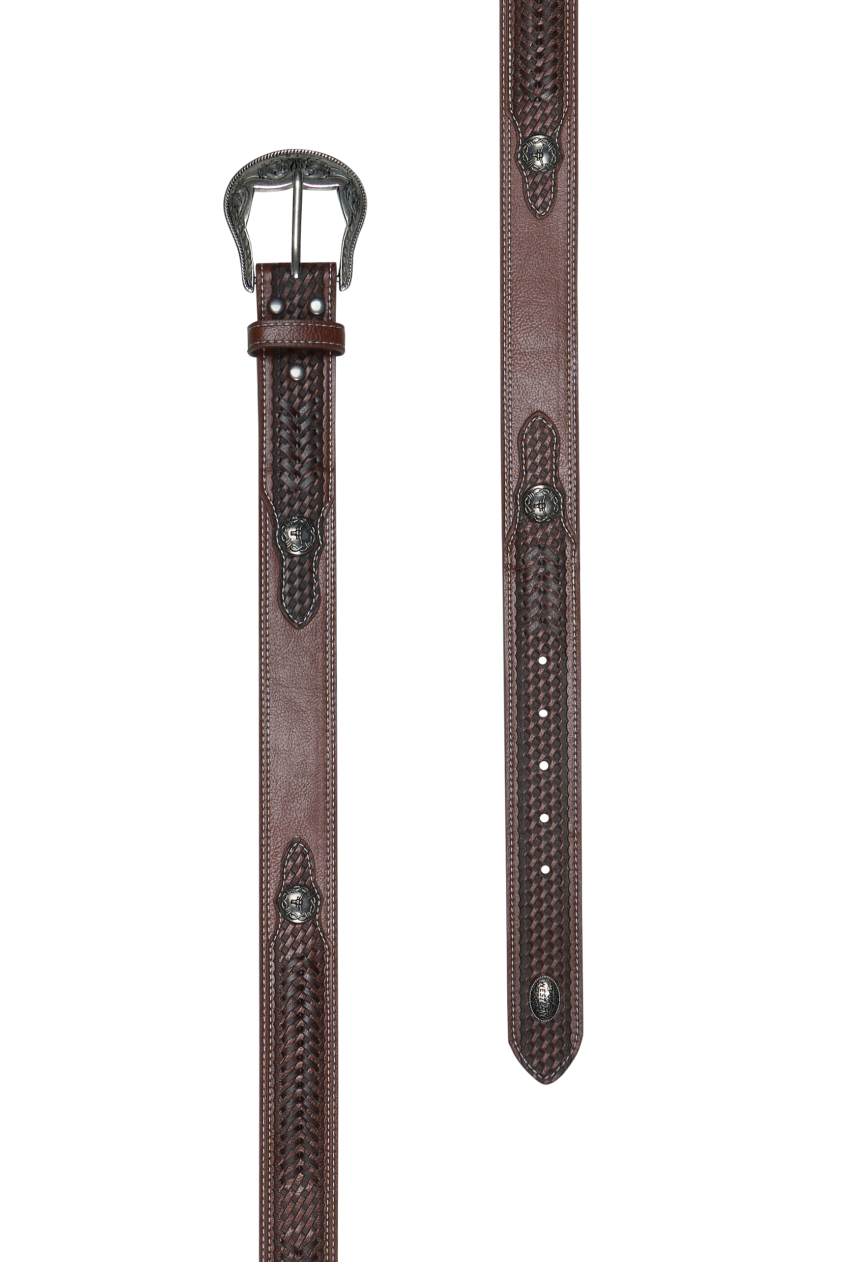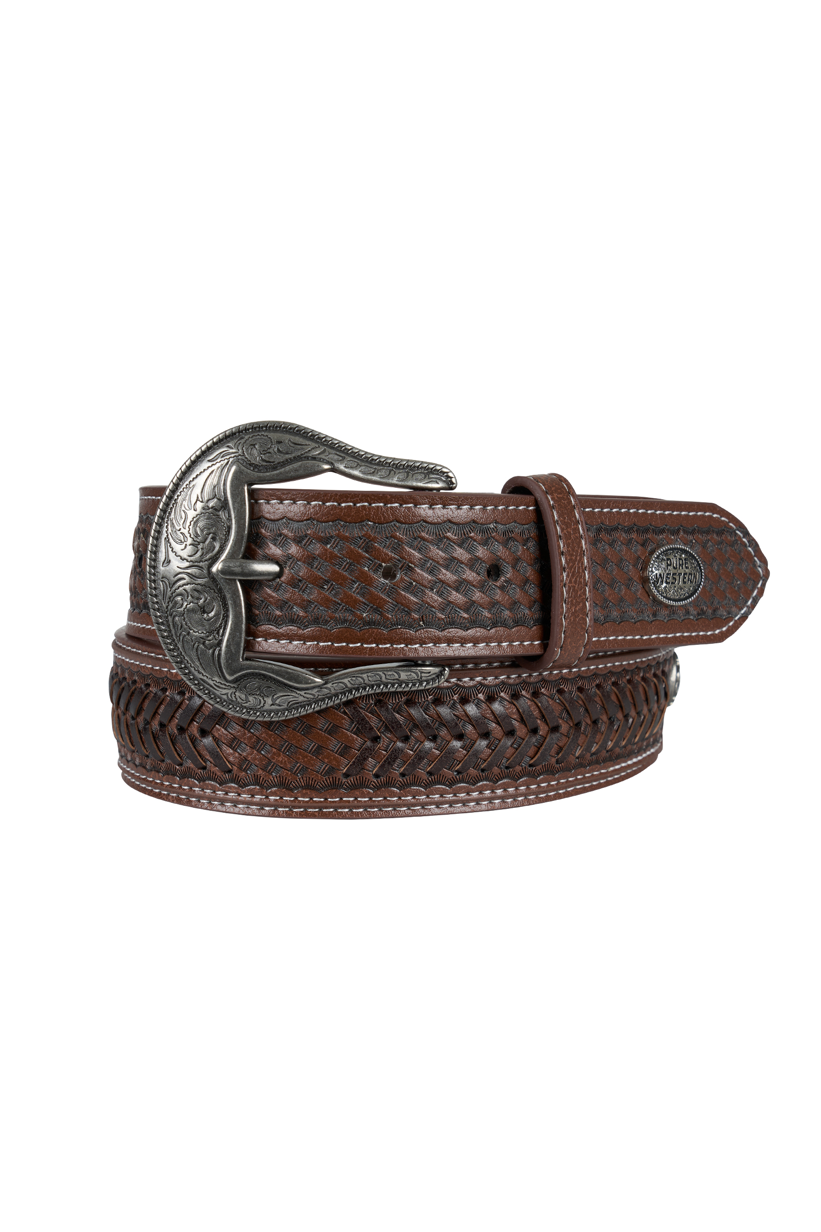The Rylan Belt brings a rugged, handcrafted feel to any outfit with its detailed hand‑laced finish, tooled tab ends, and striking longhorn conchos. Designed with a removable buckle and finished with a signature Pure Western concho, it features antique silver hardware that adds a timeless country touch. Made from a blend of PU and leather, it delivers durability, style, and everyday versatility.