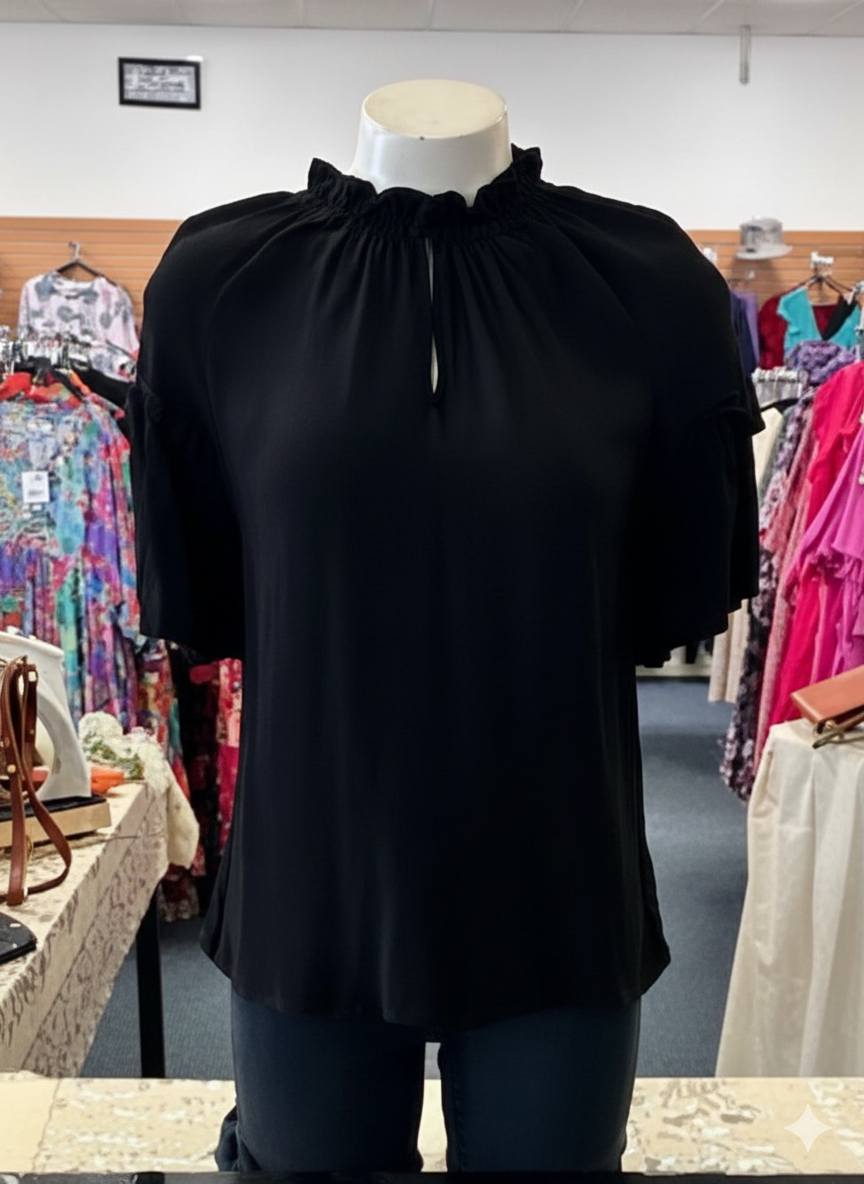 This top has a gathered neckline with a front hook and eye closure and short sleeves with a ruffle. The top is made from viscose. The colour is black.