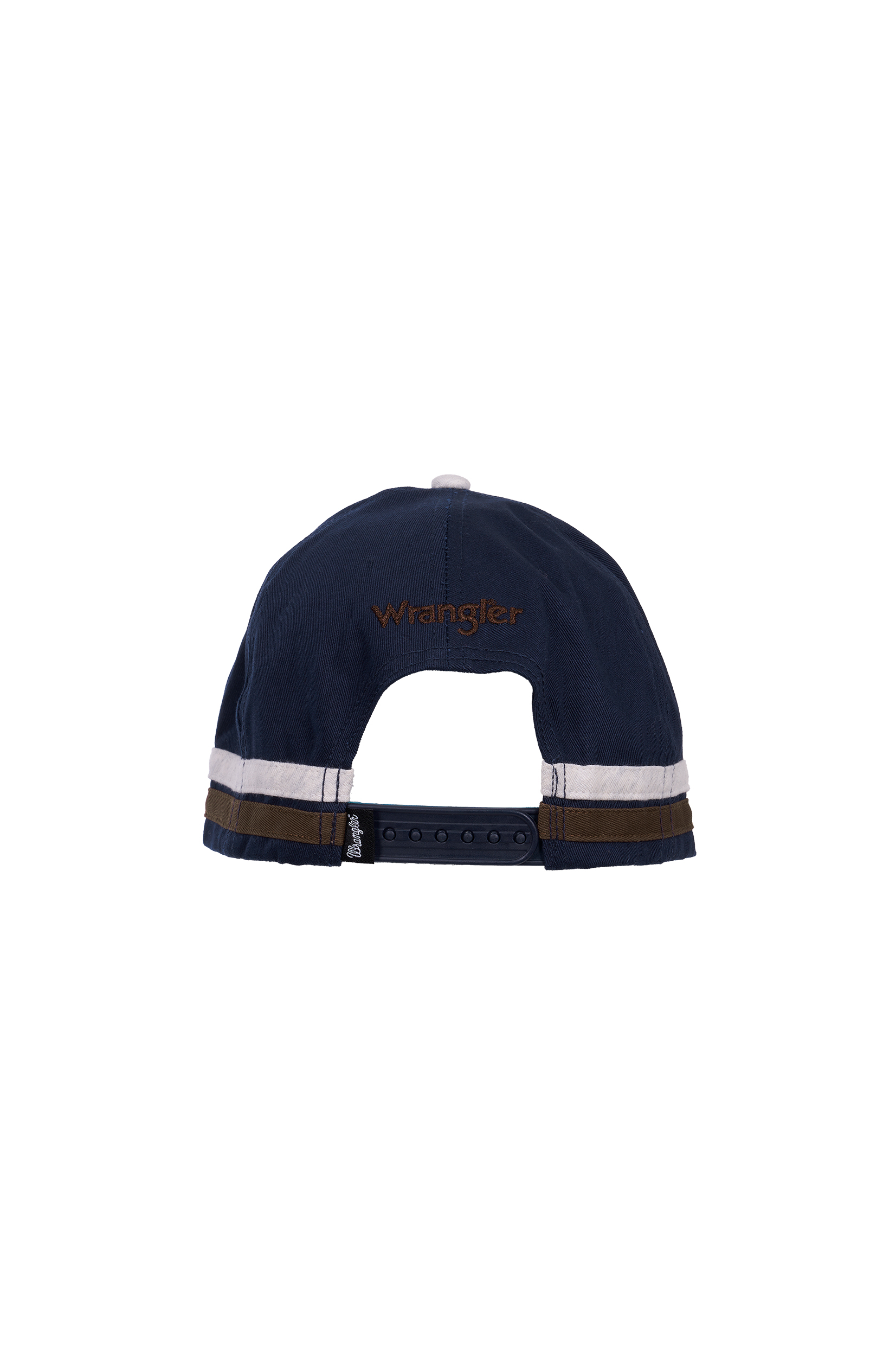 High profile 5 panel full back cap, peak with contrast print and top stitching, contrast sandwich peak, side panel taping, contrast crown piping.