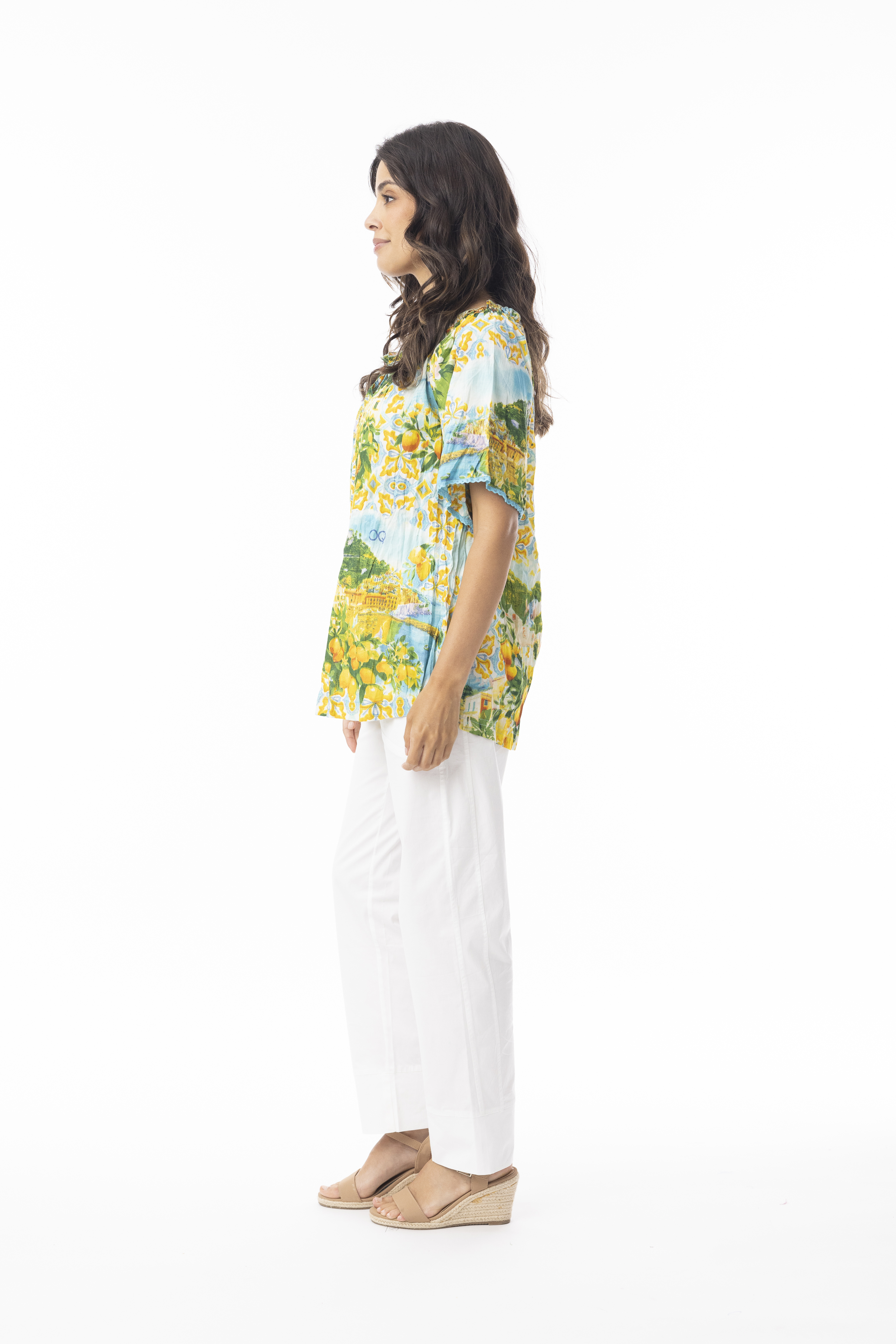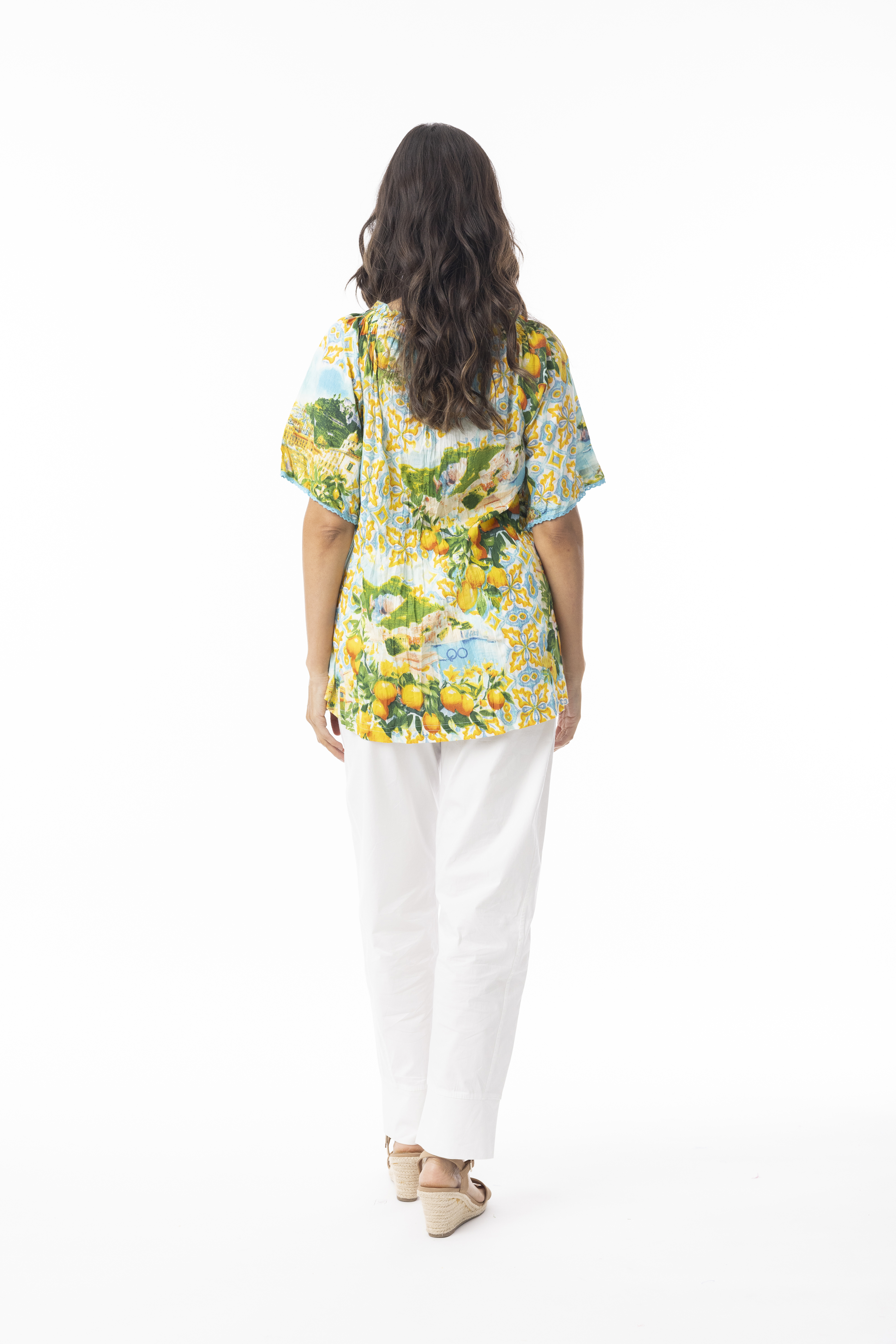Bright, breezy, and beautifully feminine — the Amalfi Frill Top is the perfect relaxed piece for warm summer days. Crafted from soft organic cotton, this easy‑fit style features an open neckline with tassel detail, short sleeves, and a delicate frill‑line collar that adds a playful touch. Finished in vibrant prints, it’s an effortless throw‑on top that pairs beautifully with shorts, capris, or your favourite denim.