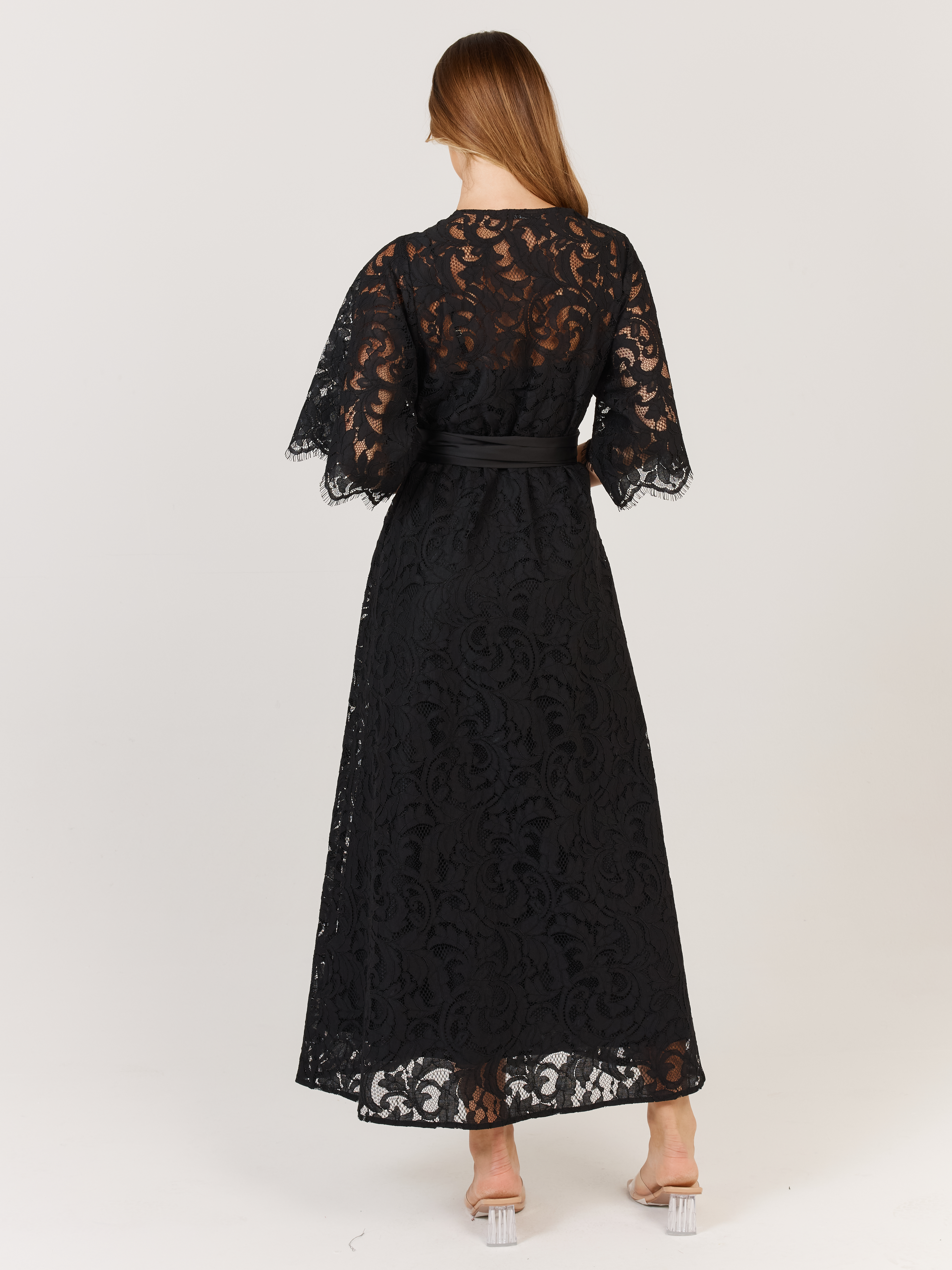 - Elbow-length lace sleeves