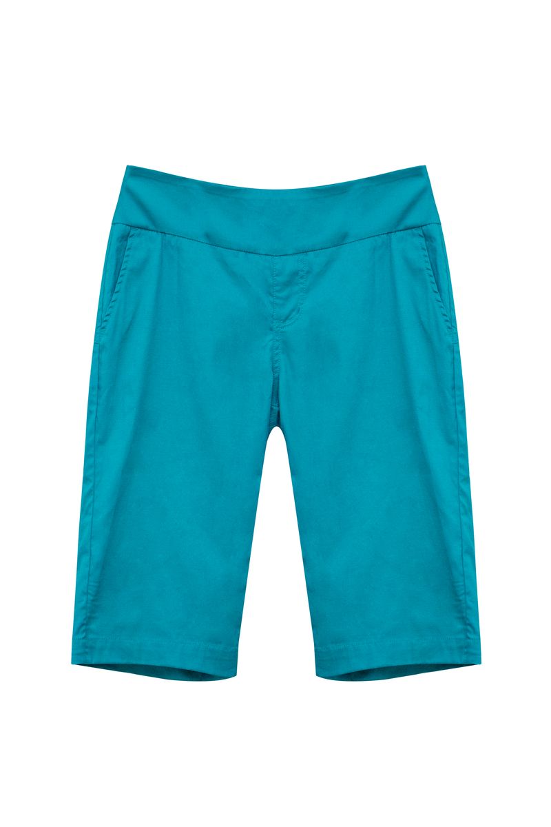 These shorts have an elastic waistband and 2 side pockets. Below the knee finish length. The shorts are made from 97% cotton and 3% elastane.