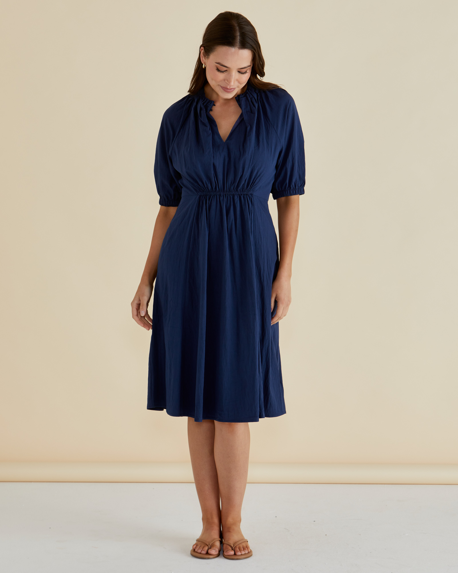 The Emery Dress combines relaxed elegance with an easy-to-wear viscose blend fabric. Its balloon sleeves and elasticated waistband create a flattering, classic silhouette. The midi length lends a sophisticated edge, making it an elevated choice for transeasonal dressing. Comfortable and stylish, it’s an effortless staple for any occasion.
