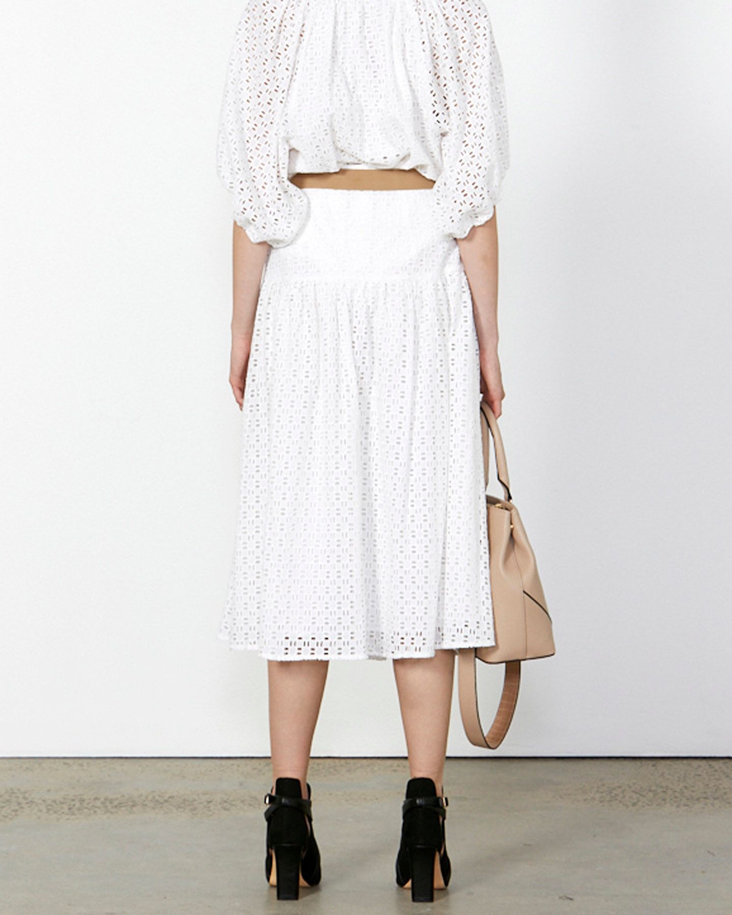 This cotton broderie skirt will pair with any top for an easy, elegant outfit. The soft material is gathered, and swings into a full silhouette. The skirt features a drop yoke style waistband.