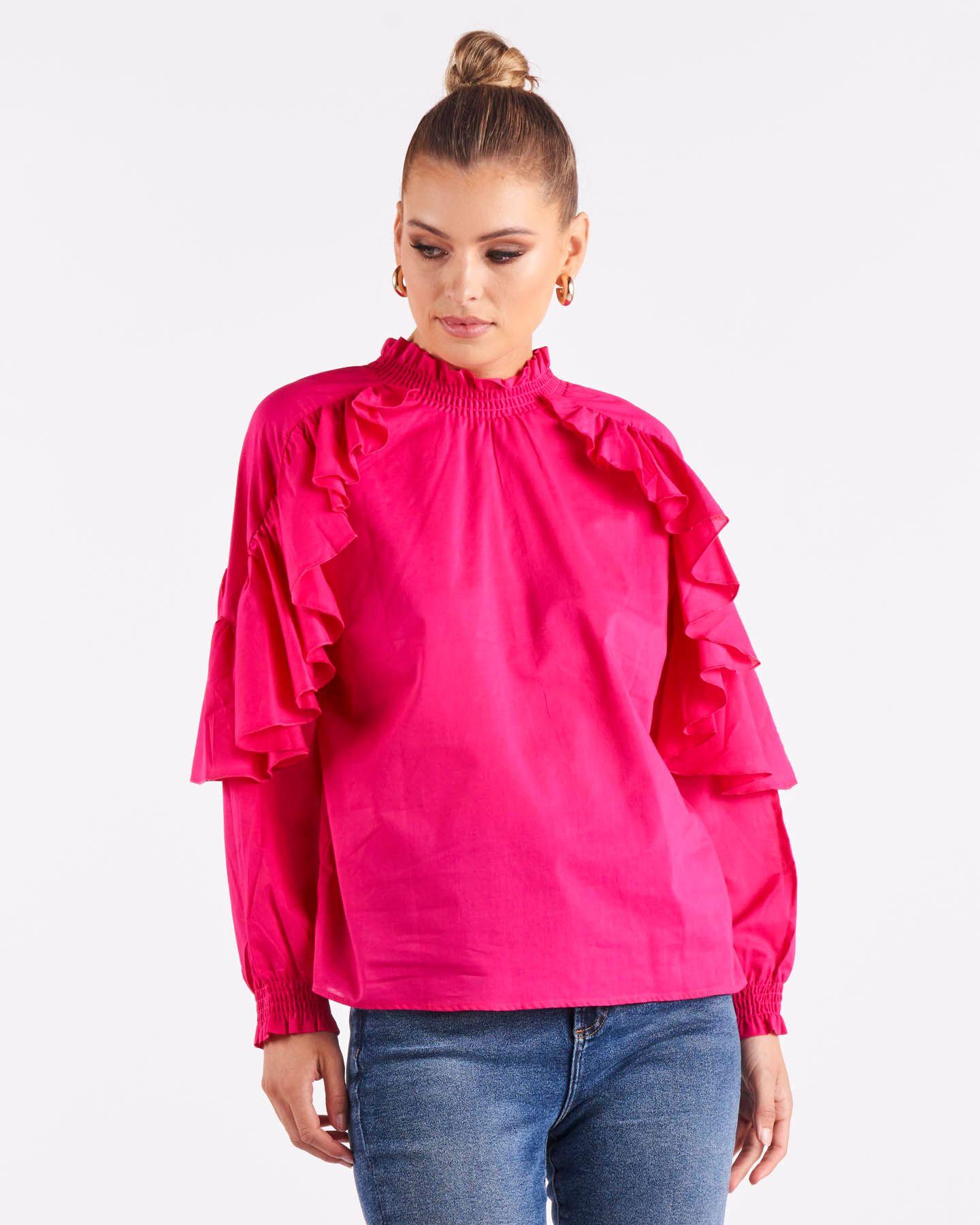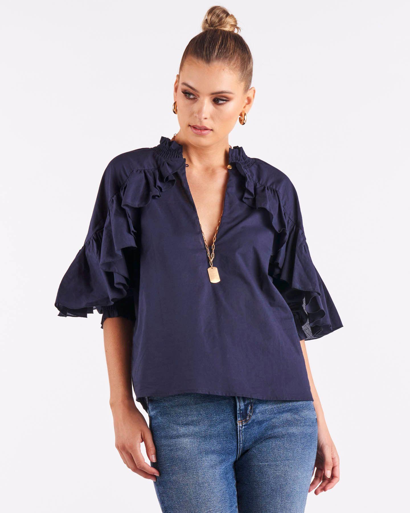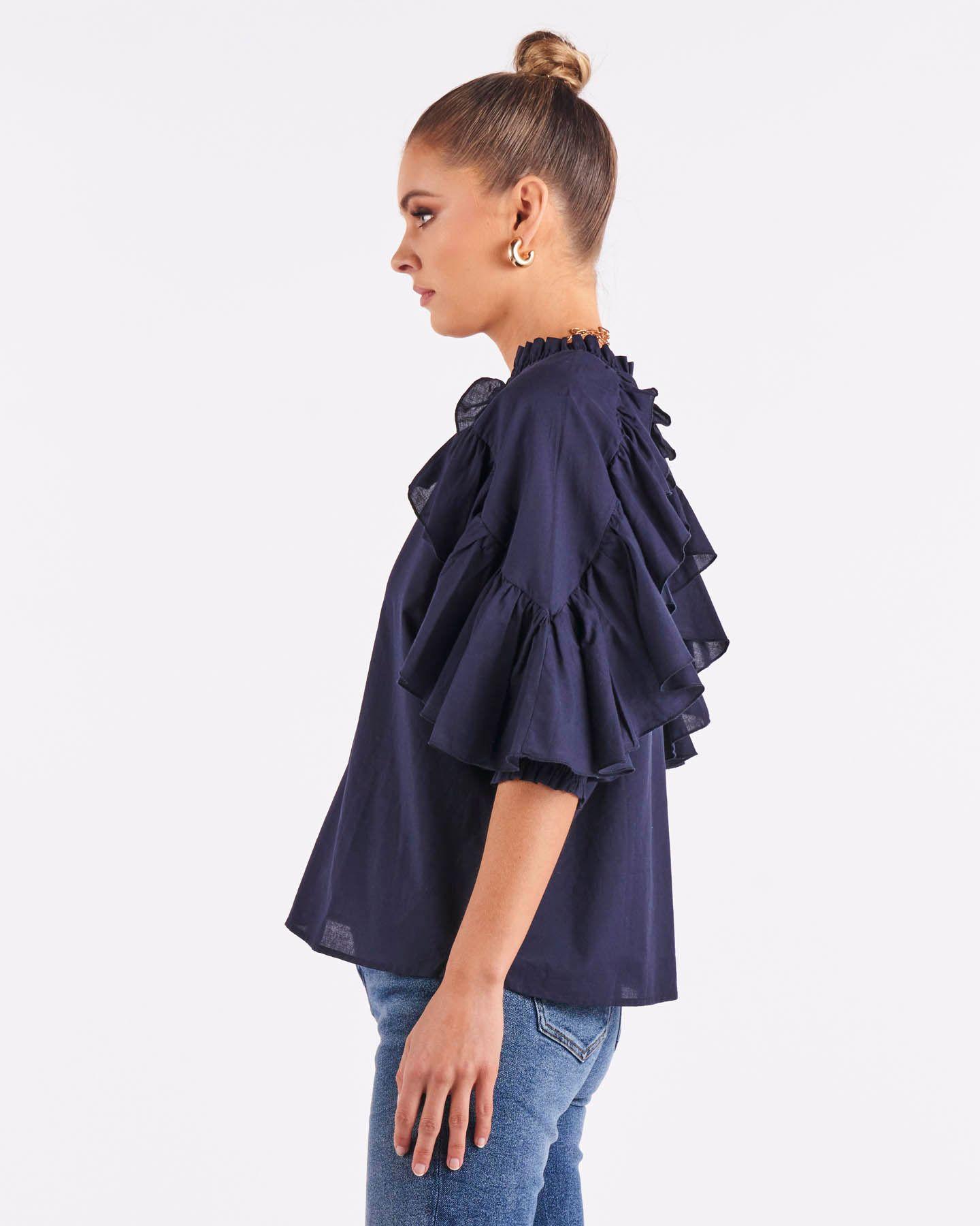 Modern elegance. Designed from soft, lightweight cotton voile, this top is elevated with ruffles along the sleeves and a curved hem.