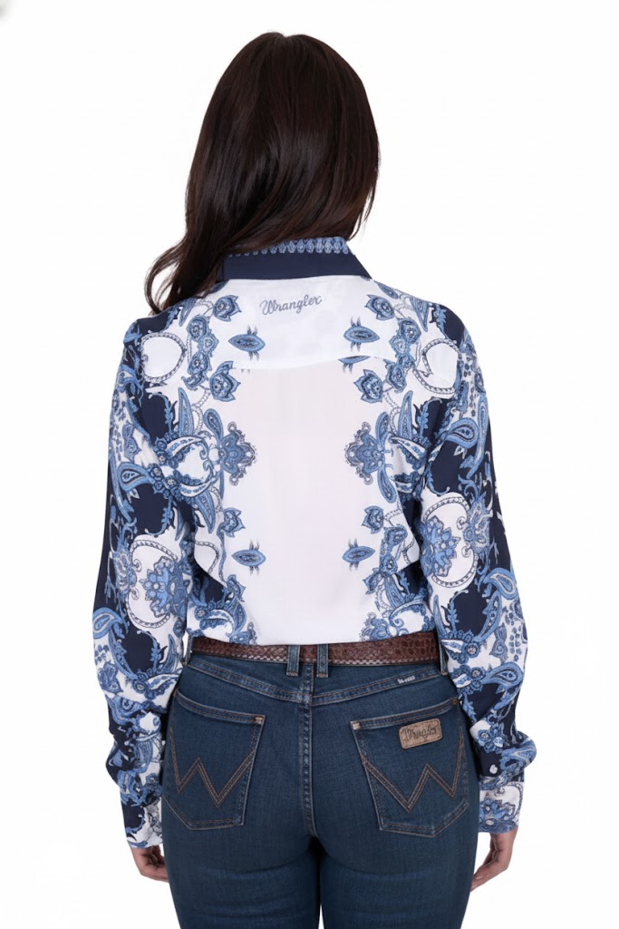 Classic button-down long-sleeve shirt, button closure, Wrangler® logo pip on side seam, soft hand feel and drape.