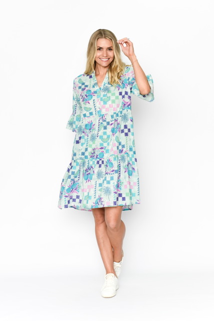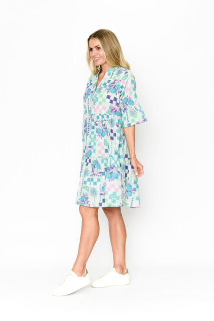 Elevate your summer style with our vibrant Maya. Made from a cotton slub, this dress creates an effortless but chic feel. Featuring a subtle v neckline with buttons for coverage and versatility, and a beautiful ¾ frill sleeve. Embrace the season in chic comfort, perfect for sunny days and cool evenings.