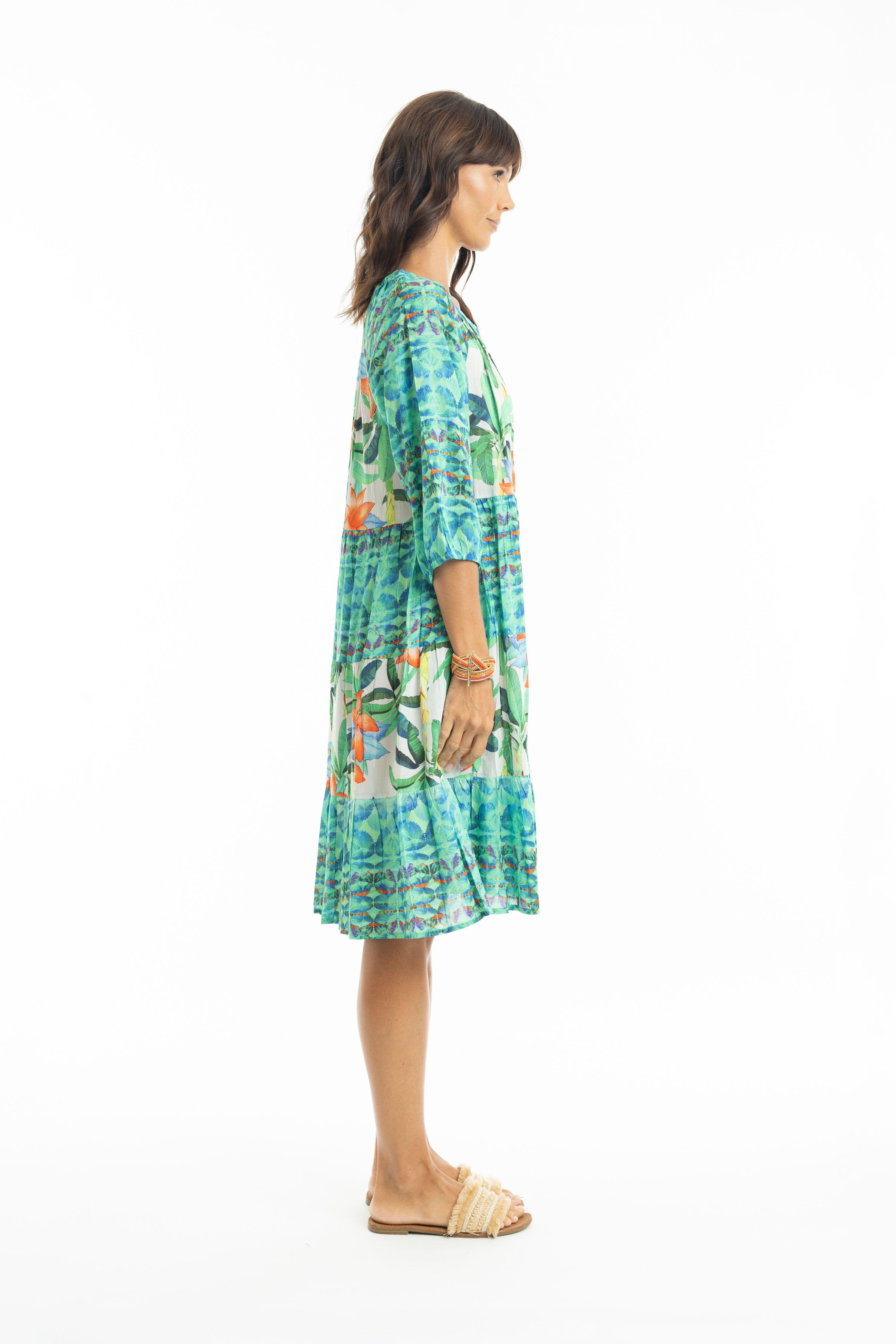 The Olivia dress is easy and tropical. Featuring a mandarin collar, raglan sleeves, a tiered skirt that falls at the knee, gathered three-quarter frill sleeves, and colourful tropical prints, this dress is so fun to wear! This is the perfect dress for a day out at the beach.