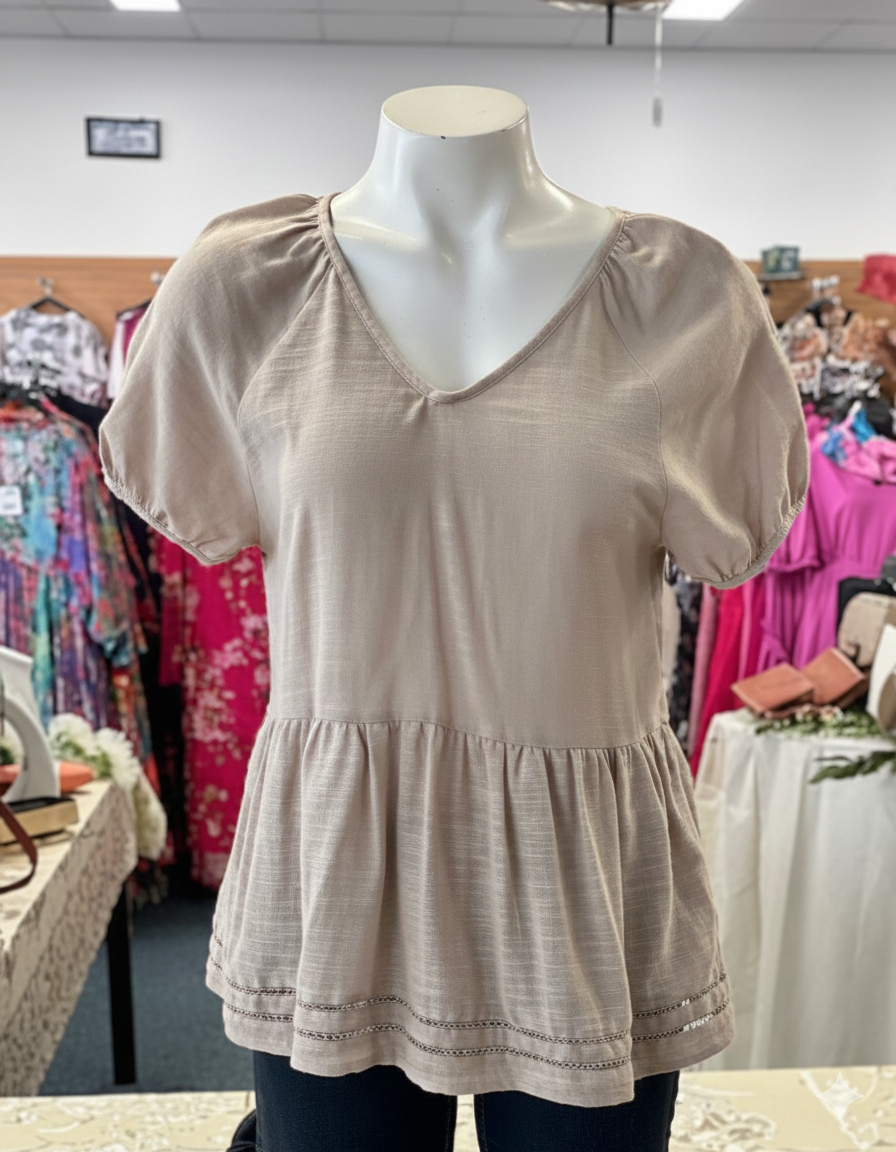 This top has a v neckline with short sleeves. The top is made form cotton/viscose blend. The Colour is stone and black.