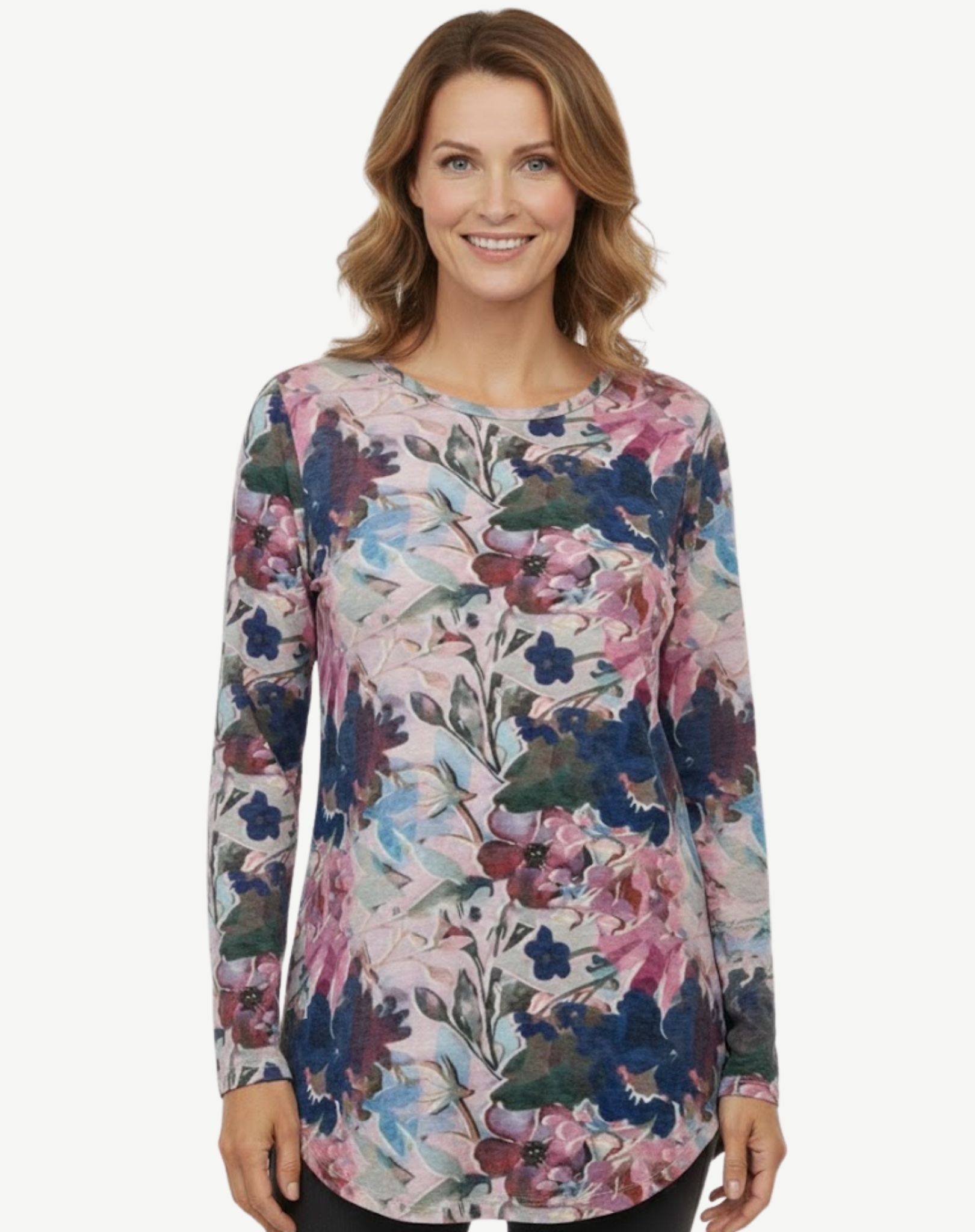 A soft and lightweight long-sleeve knit designed for effortless everyday wear. The Teal Mirage Knit Long-Sleeve Top features a classic round neckline, a flattering curved hemline, and a below-hip length for easy styling and coverage. Showcasing a beautiful blend of teal tones with a modern print, it adds a fresh pop of colour to your wardrobe. Perfect for layering or wearing on its own, this versatile piece offers comfort, style, and all-day ease.