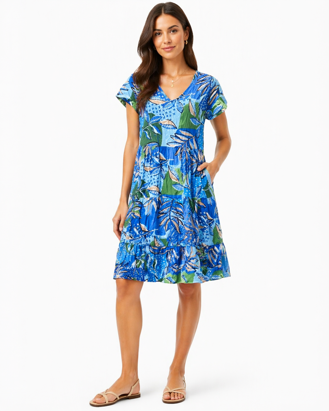 Elevate your summer style with the Thaila Dot Cross Tiered Dress, a breezy knee‑length favourite designed for carefree elegance. Crafted from 100% cotton, it features a flattering V‑neckline and comes in vibrant, eye‑catching prints that capture the spirit of the season. The relaxed tiered silhouette makes it perfect for leisurely strolls, garden parties, and every sunny moment in between. Light, easy, and effortlessly feminine — a true warm‑weather essential.