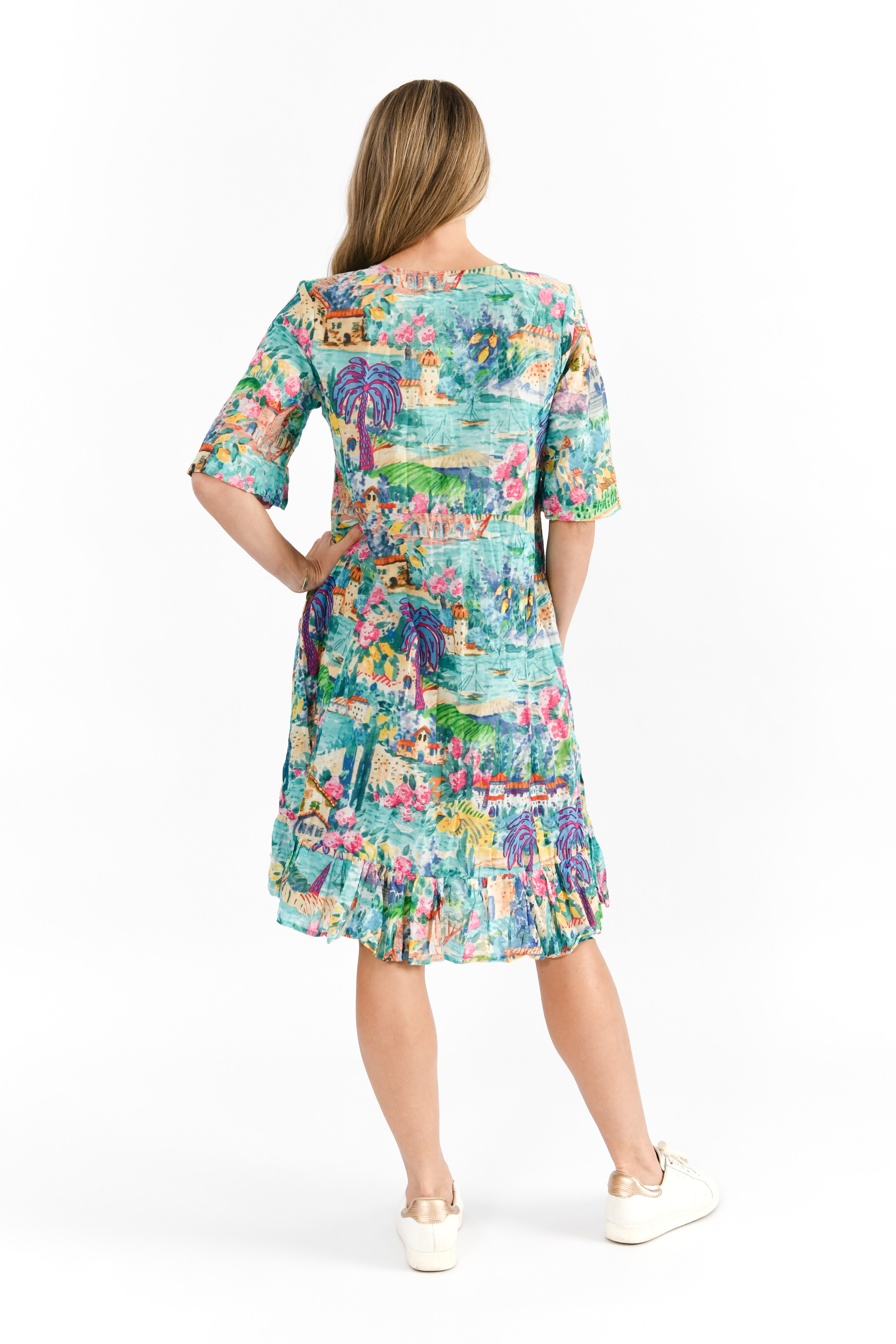 Effortlessly stylish and endlessly wearable, the Charli Tassel Dress is a versatile wardrobe staple designed for comfort and flair. Crafted from 100% cotton, this knee-length dress features a flattering V-neckline with a playful tassel tie-front detail. The smocked waist adds gentle definition, while the tiered skirt creates graceful movement with every step. With its 3/4 sleeves and in-built pockets, this dress blends functionality with relaxed elegance. Perfect for resort wear, daytime events, or casual brunches, the monochrome palette lends a timeless, sophisticated charm