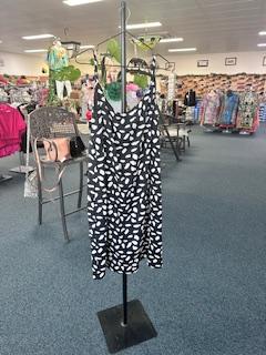 This dress has a round neckline with shoestring straps, a frame skirt with a black overlay top with elastic round neckline, and long sleeves with shirring cuffs. The dress is made from polyester. The colour is black and white.
