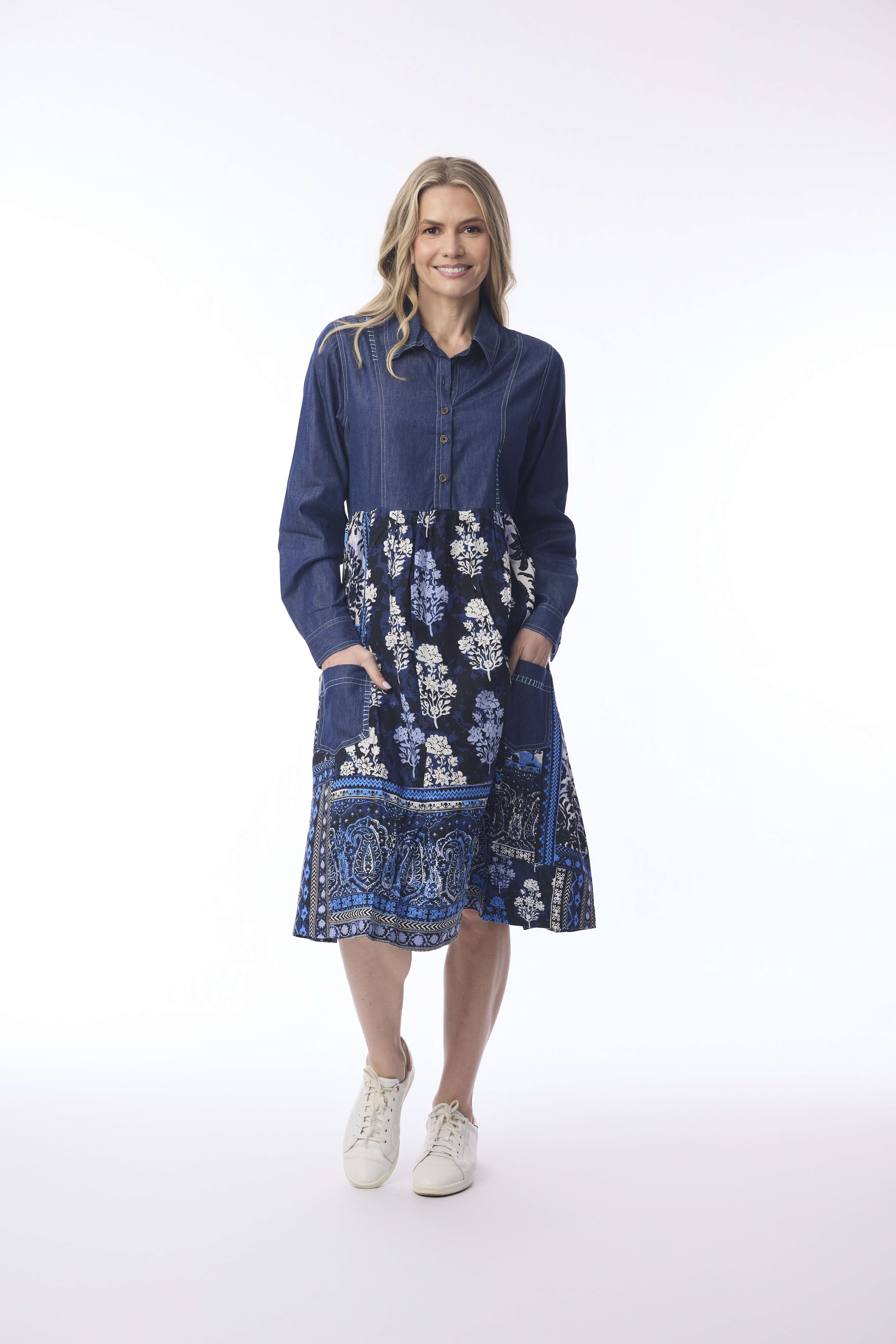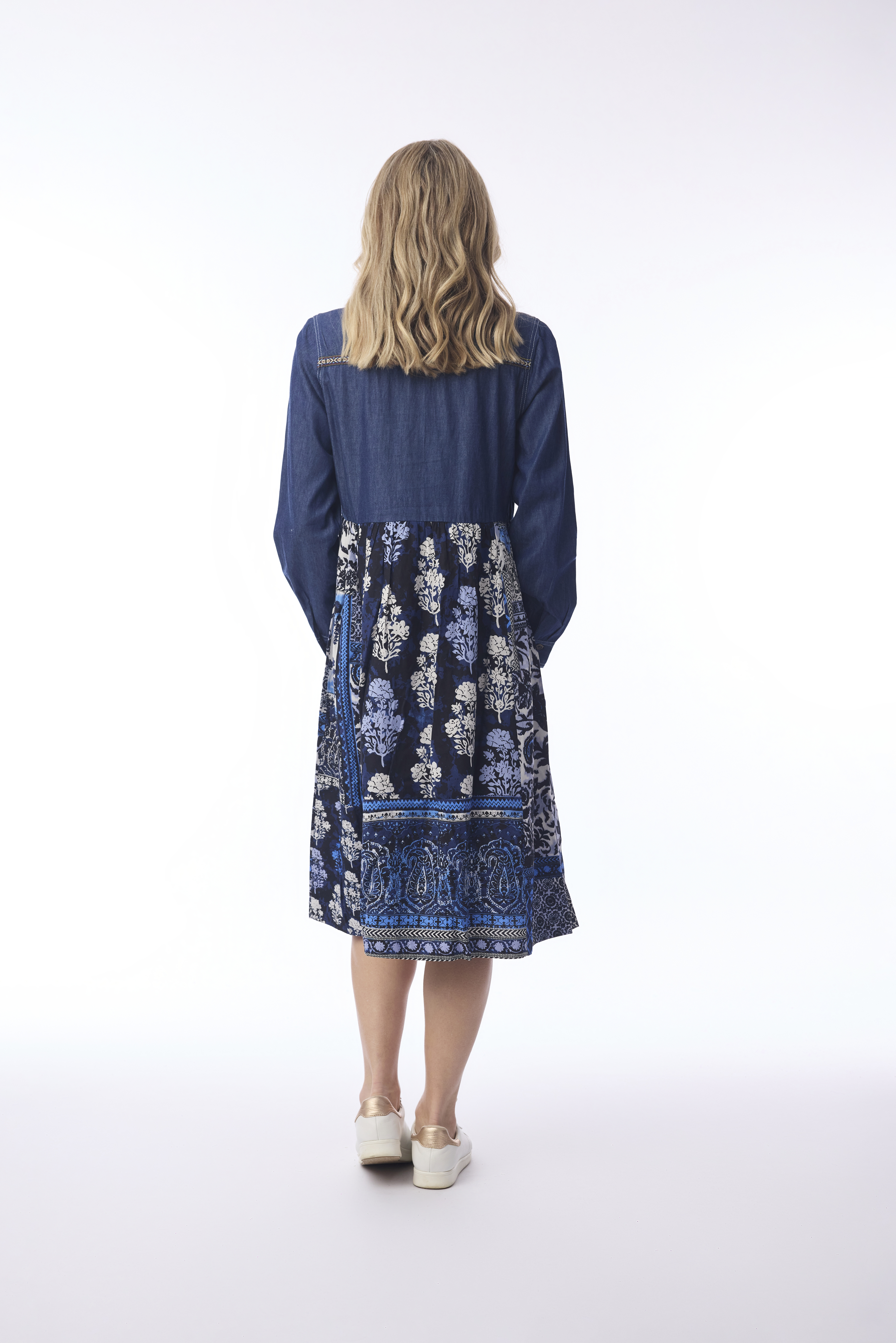 The Bhadoi Dress brings a modern twist to bohemian style, blending the casual charm of denim with the artistry of intricate prints. Crafted from 100% rayon, this midi-length dress features a shirt-style denim bodice with classic collar, button-down placket, and detailed white topstitching. Flowing into an A-line skirt, the design showcases a rich floral and paisley print with striking border patterns in shades of blue and white. Finished with denim patch pockets and long sleeves with button cuffs, this piece pairs everyday ease with statement detailing — perfect for adding a touch of creativity to your wardrobe.
