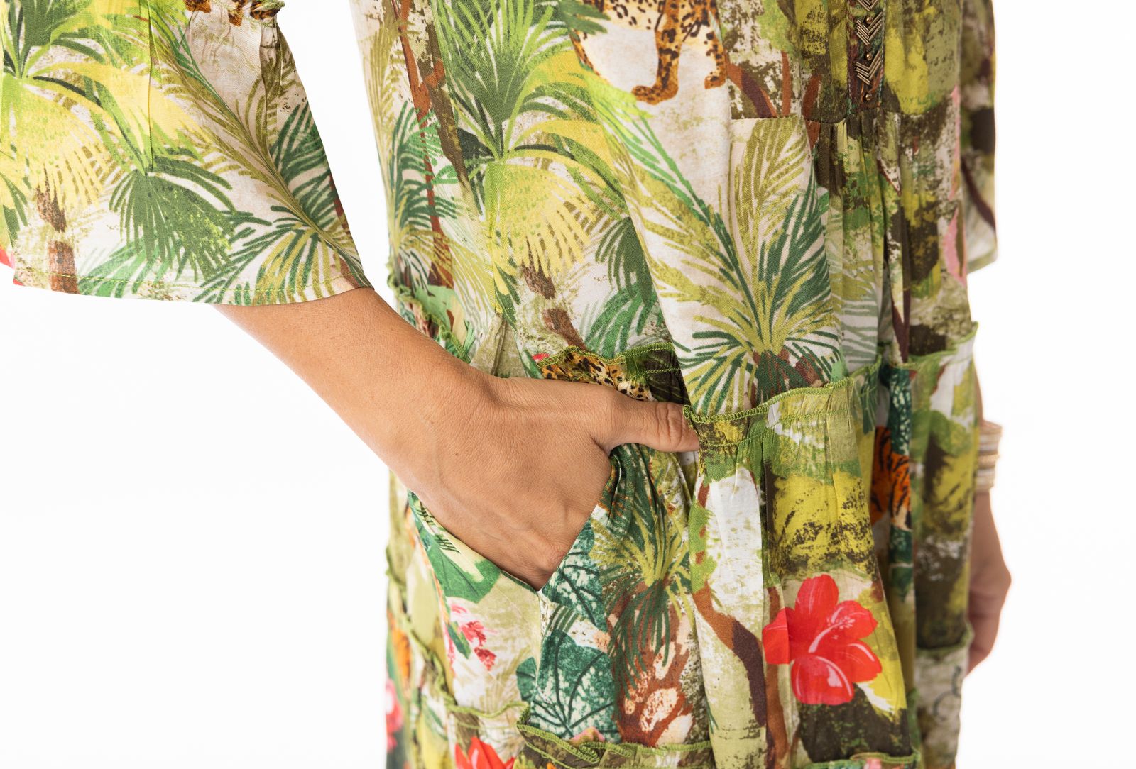 Let wanderlust bloom in the horizon-chasing Cecilia Frill Sleeve Dress. Featuring a button up mandarin collar, a frill tiered skirt that falls at the knee, three-quarter frill sleeves, and unique wild tropic print, this dress is so easy to wear. The perfect dress for soaking up the sun on the warm sunny sand!