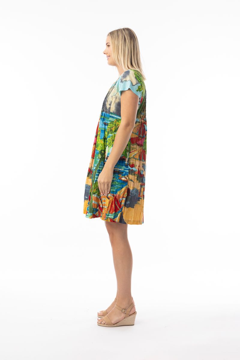 Welcome summer in our Ibiza easy fit dress. Featuring a flattering v-neckline, chic pleats at the bust, and short sleeves, this piece offers a stylish solution for any occasion. Your new go-to summer dress!