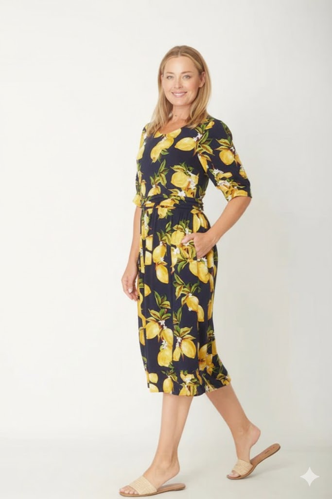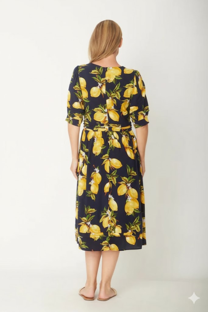 This Lemon Midi Dress in Navy and Lemon offers a flattering scoop neck and sophisticated pleated details on puff sleeves, waist, and hem for refined style. Made from structured yet comfortable non-stretch rayon, it ensures a polished look with ease. The back zipper provides convenient wear, while the midi length makes it perfect for any occasion. True to size, this dress combines elegance and practicality seamlessly.