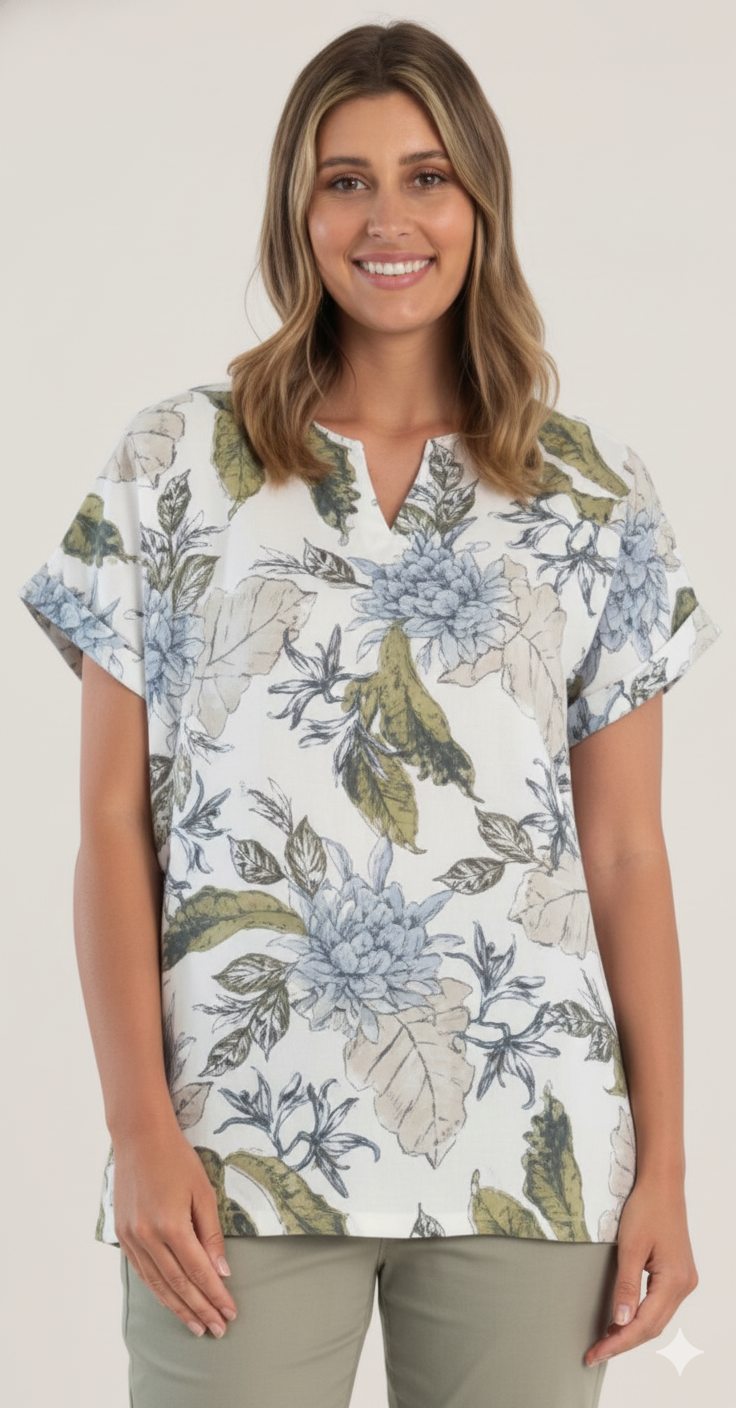 this top has a v-neckline with an extended sleeve and cuff. The top is made 80% linen and 20% cotton. The colour is sky.