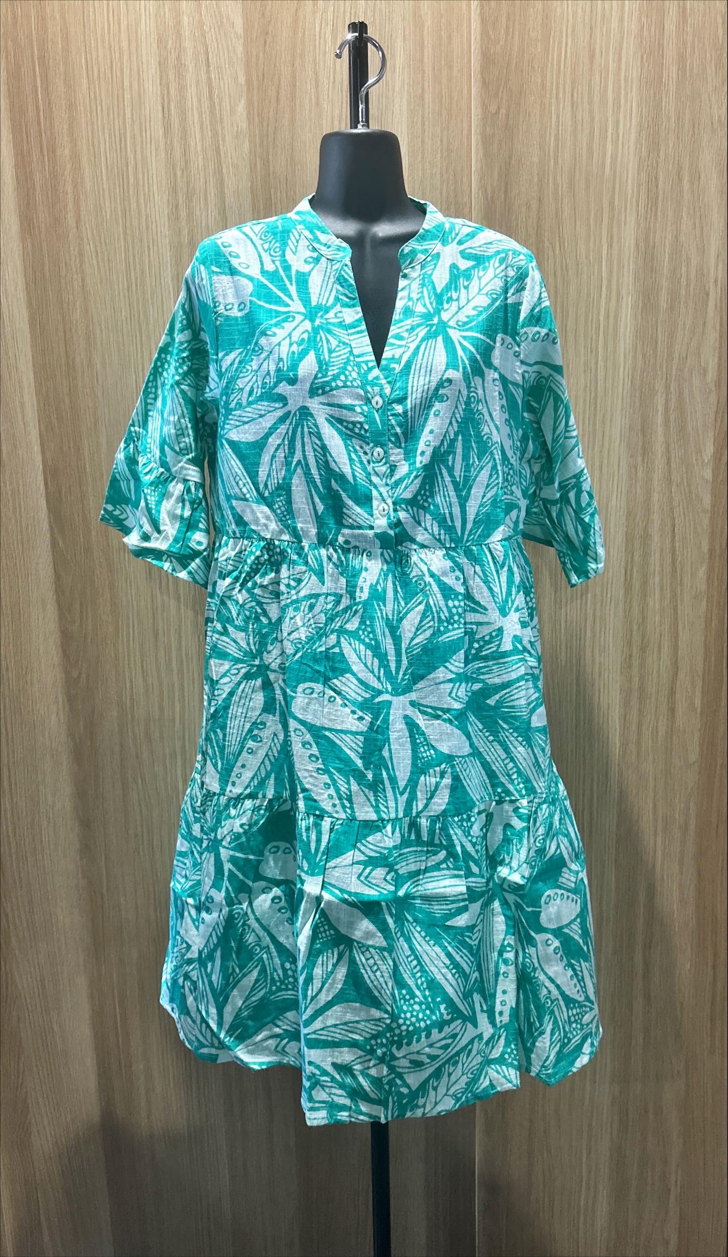 Elevate your summer style with our vibrant Maya. Made from a cotton slub, this dress creates an effortless but chic feel. Featuring a subtle v neckline with buttons for coverage and versatility, and a beautiful ¾ frill sleeve. Embrace the season in chic comfort, perfect for sunny days and cool evenings.