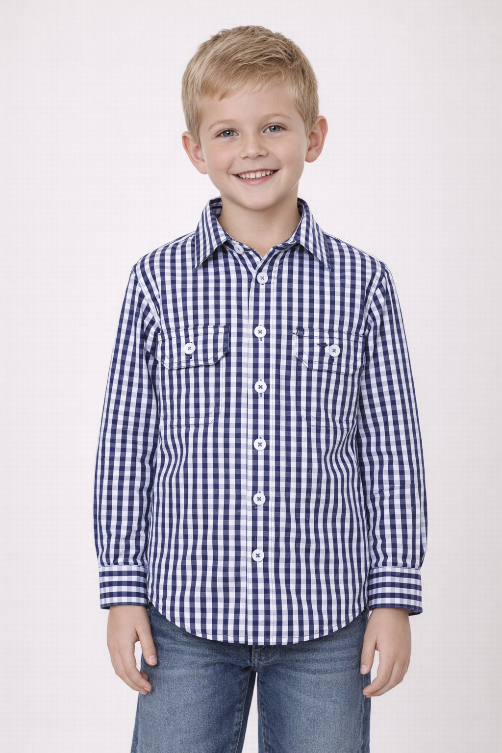 This Navy and White Children’s Check Long Sleeve Shirt is crafted from premium 130gsm high‑count fine cotton, offering a soft, breathable feel that’s perfect for everyday wear. The fabric is mercerised, double pre‑shrunk, and garment‑washed with a peach finish, giving it long‑lasting comfort and durability.