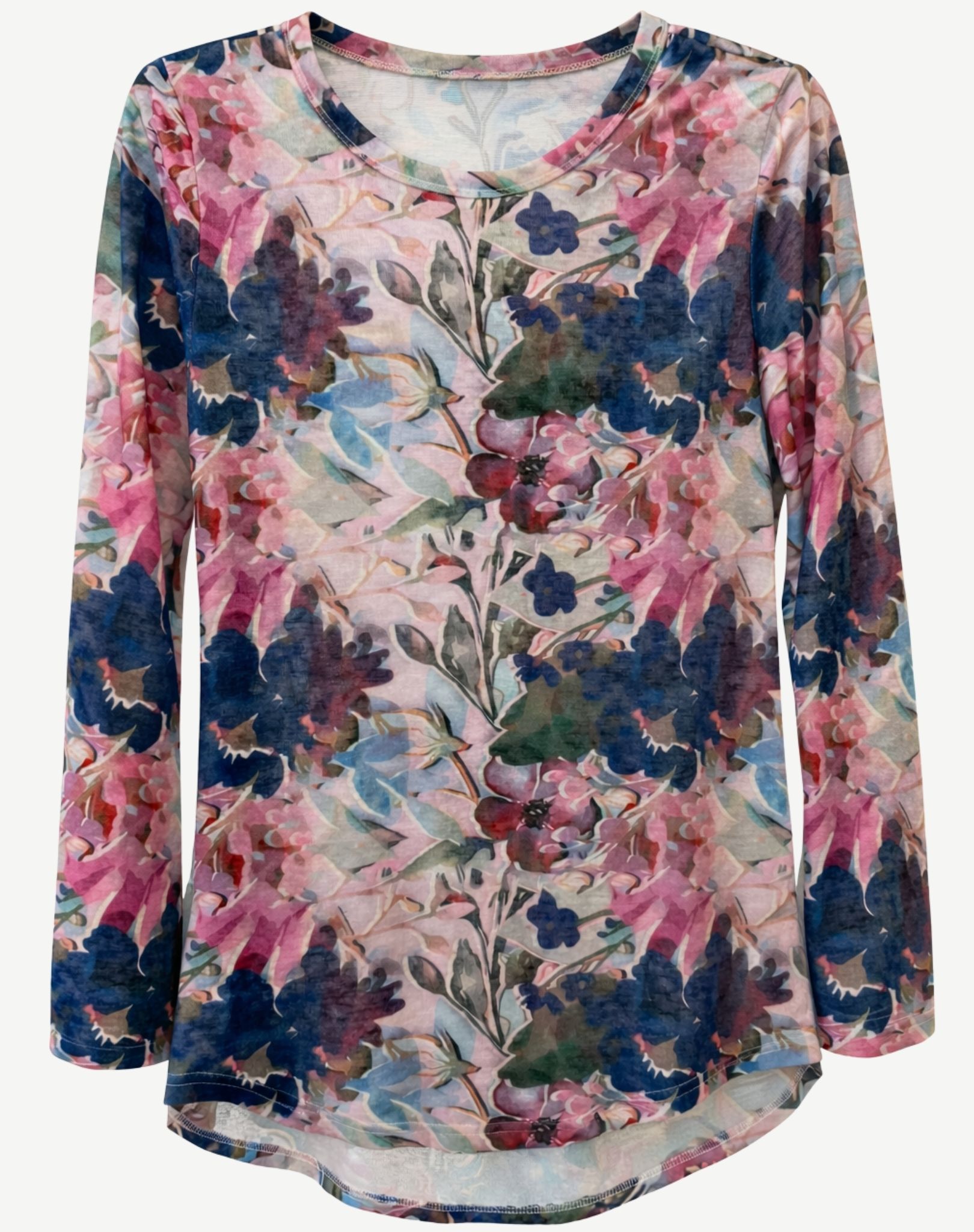 A soft and lightweight long-sleeve knit designed for effortless everyday wear. The Teal Mirage Knit Long-Sleeve Top features a classic round neckline, a flattering curved hemline, and a below-hip length for easy styling and coverage. Showcasing a beautiful blend of teal tones with a modern print, it adds a fresh pop of colour to your wardrobe. Perfect for layering or wearing on its own, this versatile piece offers comfort, style, and all-day ease.